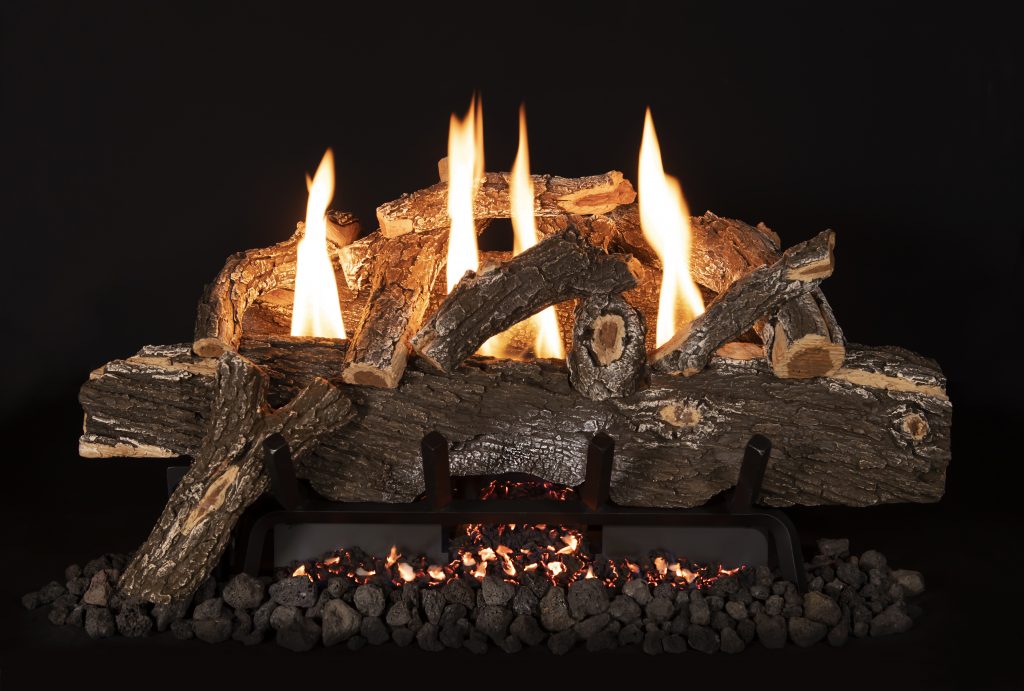Lively flames and a large ember bed highlight the handcrafted logs, adding efficient heat and unmatched beauty to your fireplace. Featuring an Indoor (Black) burner with four log set options: Weathered Oak, Red Oak, Split Oak, and Aspen.